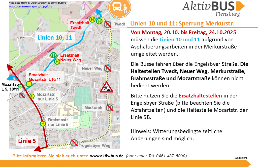 Seit Montag, 20.10.2025 müssen die Linien 10 und 11 aufgrund von Asphaltierungsarbeiten in der Merkurstraße umgeleitet werden. Die Busse fahren über die Engelsbyer Straße. Die Haltestellen Twedt, Neuer Weg, Merkurstraße, Brahmsstraße und Mozartstraße können nicht bedient werden. Bitte nutzen Sie die Ersatzhaltestellen in der Engelsbyer Straße (bitte beachten Sie die Abfahrtzeiten) und die Haltestelle Mozartstr. der Linie 5B.